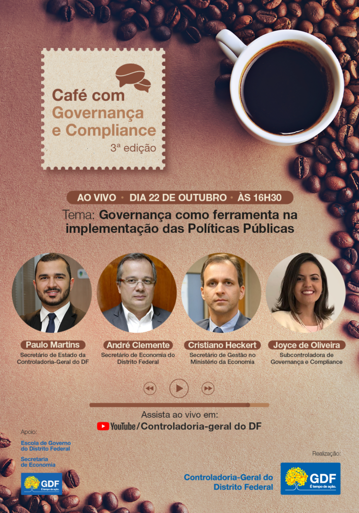 A Controladoria-Geral do Distrito Federal (CGDF) realizará a 3ª edição do Café com Governança e Compliance, evento mensal transmitido pelo canal do Youtube da CGDF, com o tema “Governança como ferramenta na implementação das Políticas Públicas”.