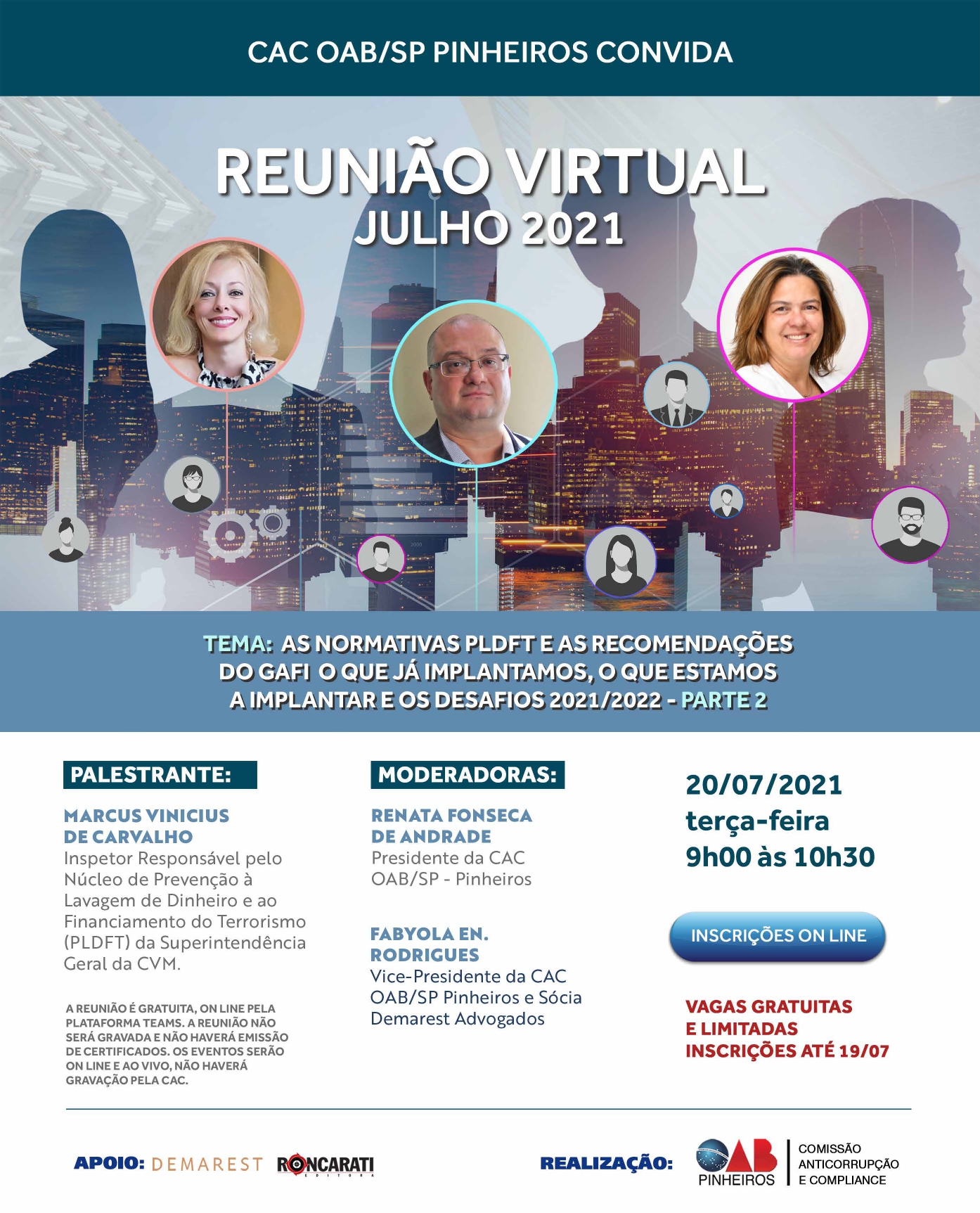CAC OAB/SP Pinheiros convida para Reunião Virtual, em 20.07