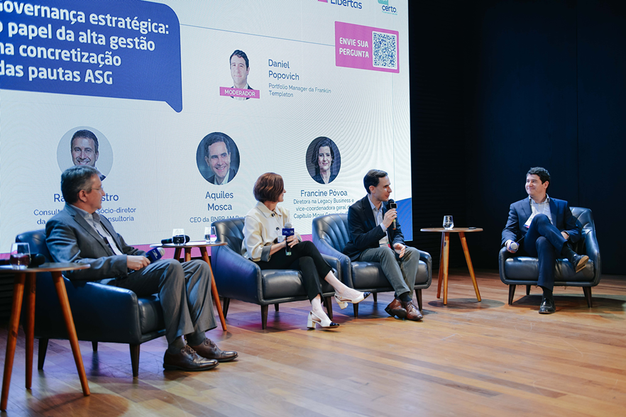 Na parte da tarde, foram realizados três painéis. O primeiro deles, “Governança Estratégica: o papel da alta gestão na concretização das pautas ASG”, foi moderado por Daniel Popovich, Portfolio Manager da Franklin Templeton, e contou com a participação de Aquiles Mosca (BNP Paribas), Rafael Castro (PRI) e Francine Póvoa (IBGC). O principal tema, ASG, contemplou sua regulação, boas práticas, exemplos e benefícios.