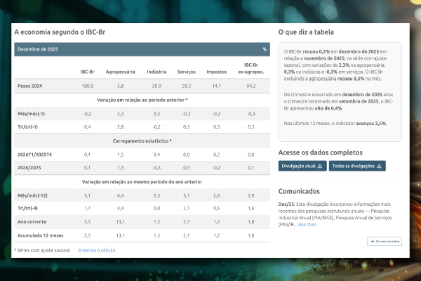 Assim, a página torna as informações sobre IBC-Br mais acessíveis ao público não especializado, amplia a visibilidade do indicador e facilita o acompanhamento da atividade econômica do Brasil. A página já está no ar com os dados da última divulgação do IBC-Br, referentes a dezembro de 2025.