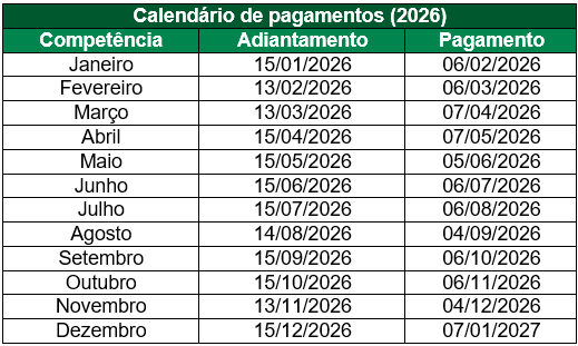 - Adiantamento – dia 15 de cada mês, ou no dia útil imediatamente anterior, caso o dia do adiantamento seja sábado, domingo ou feriado; e