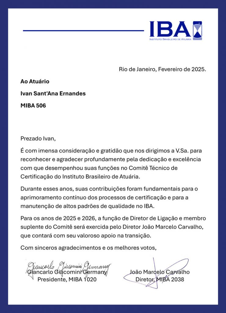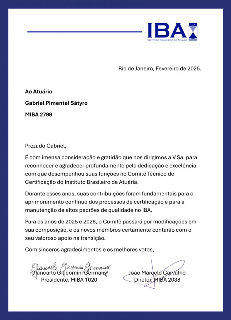 É com imensa consideração e gratidão que nos dirigimos a todos para reconhecer e agradecer profundamente pela dedicação e excelência com que Gabriel Sátyro e Ivan Sant’Ana Ernandes desempenharam suas funções no Comitê Técnico de Certificação do Instituto Brasileiro de Atuária (IBA).