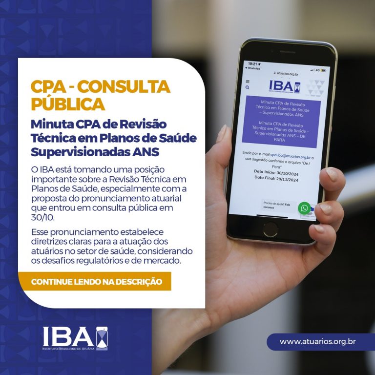 O IBA está tomando uma posição importante sobre a Revisão Técnica em Planos de Saúde, especialmente com a proposta do pronunciamento atuarial que entrou em consulta pública em 30/10. Esse assunto tem sido debatido ao longo do ano pelo Grupo de Trabalho específico e recebeu a aprovação do Comitê Técnico antes de ser submetido ao Comitê de Pronunciamentos Atuariais.