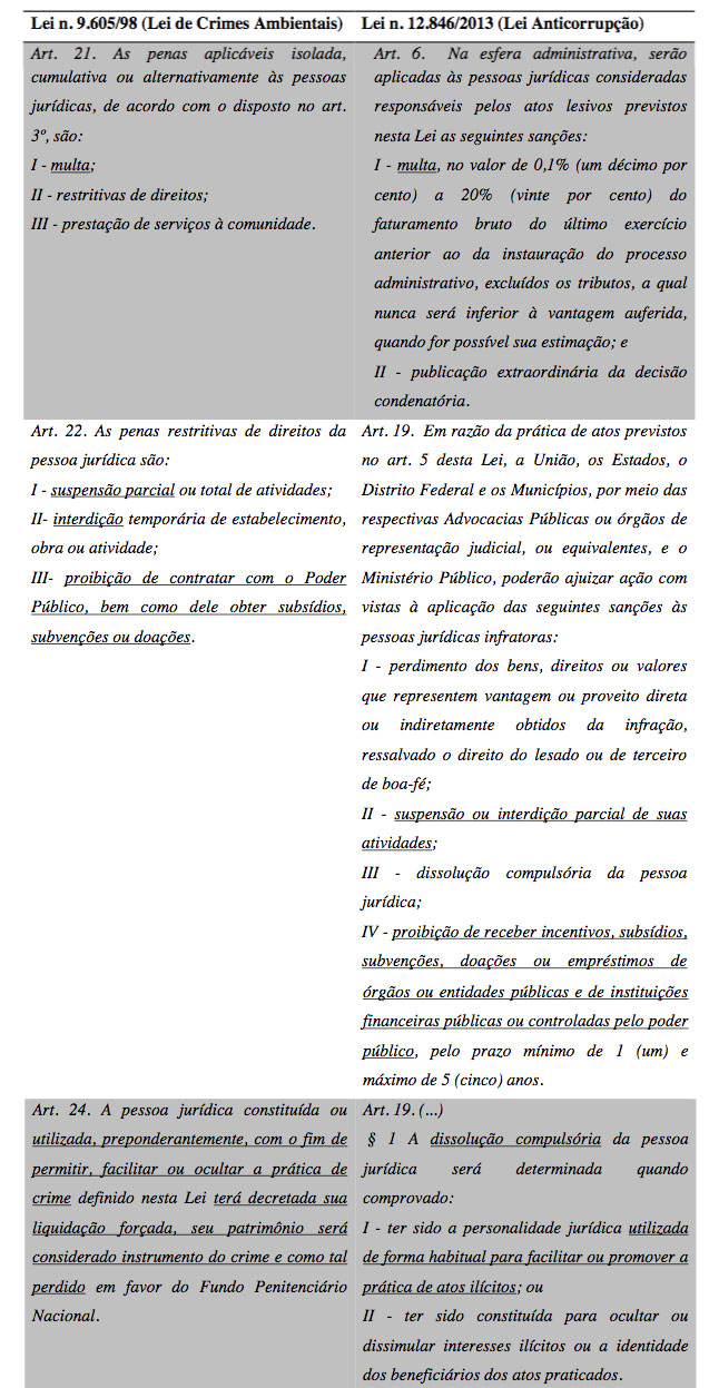 Mais uma vez, a semelhança entre as premissas de responsabilização desta lei com a de crimes ambientais, – que as claras arvora a responsabilidade penal da pessoa jurídica –, é patente, conforme se verifica no quadro abaixo: