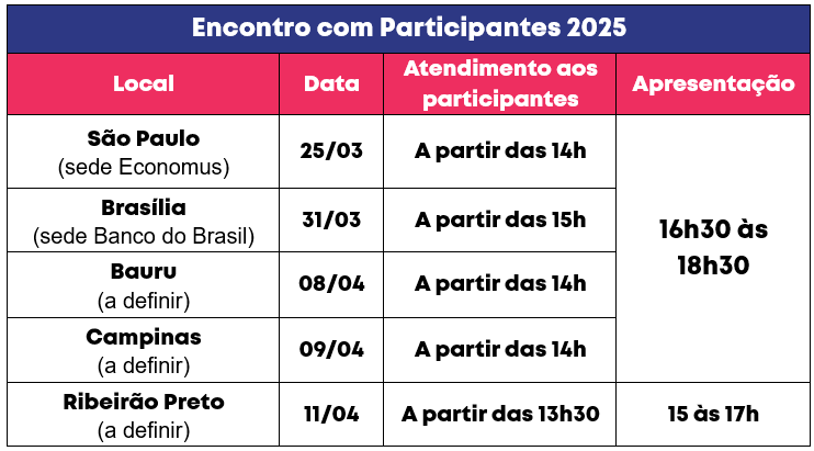 Nas próximas semanas, o Economus promoverá encontros presenciais com os seus participantes para apresentar os resultados de 2024 e os atuais desafios do Instituto. Além de ter a oportunidade de conversar diretamente com os nossos administradores, colaboradores do Economus estarão presentes e disponíveis para realizar atendimentos e tirar dúvidas.