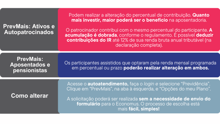 Os participantes ativos e autopatrocinados do PrevMais já podem realizar alterações no percentual de contribuição mensal, que varia entre 2% e 8%. Já os aposentados e pensionistas, que recebem benefício por renda mensal programada e prazo certo, também poderão alterar os parâmetros de percentual, que variam entre 0,5% e 2%, e de prazo de benefício, respectivamente.