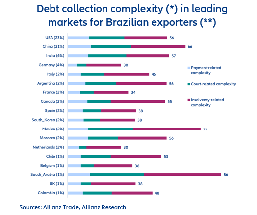 - Arábia Saudita, México e Emirados Árabes Unidos são os países mais complexos para os exportadores recuperarem dívidas comerciais.