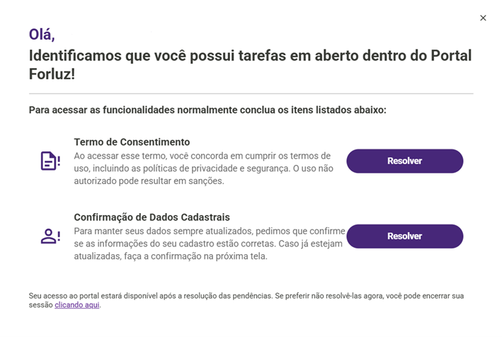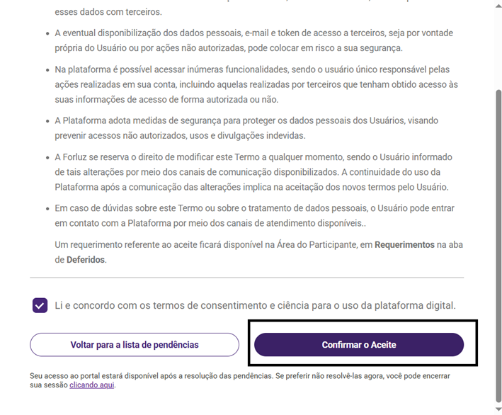 A partir de hoje (18/2), será necessário realizar o aceite do Termo de Consentimento na Área do Participante, no Portal Forluz. O alerta será exibido para o usuário na página inicial do ambiente, assim que ele fizer o login.