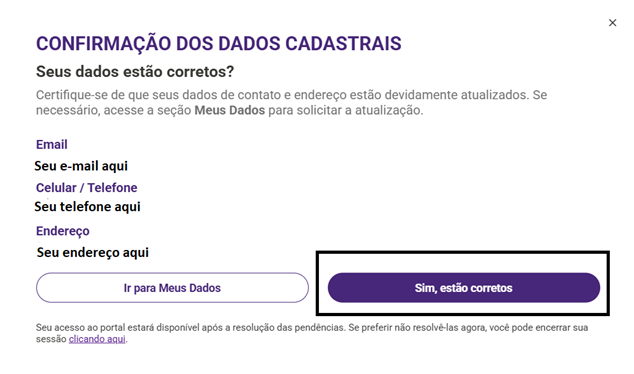 3. Em seguida, a página retornará para a lista de tarefas em aberto, caso o participante precise conferir suas informações de cadastro. Os dados serão exibidos conforme abaixo. Se estiverem corretos, clique em “Sim, estão corretos". Caso contrário, selecione “Ir para Meus Dados" e faça as edições adequadas.