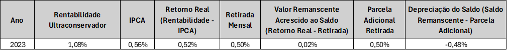 Porém, se este participante tivesse optado por receber a parcela adicional em dezembro de 2023, teria ocorrido a depreciação do saldo de conta. A soma da retirada mensal (0,50%), da Parcela Adicional (0,50%) e da inflação (0,56%) totalizava 1,56%. A rentabilidade de 1,08% é excelente, mas insuficiente para comportar duas retiradas no mesmo mês, sem que haja redução do saldo. Sendo assim, a parcela mensal e a adicional teriam gerado uma depreciação de -0,48% no saldo de conta de aposentadoria.