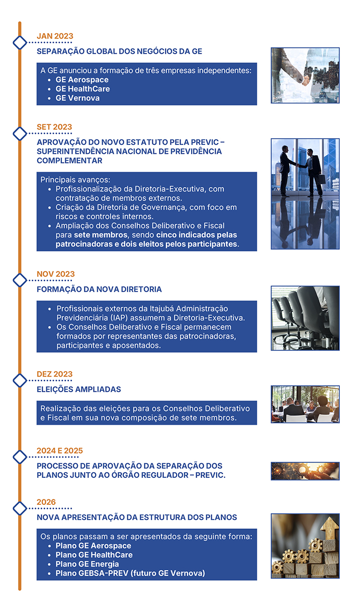 A partir de agora, os planos serão identificados como GE Aerospace, GE HealthCare, GE Energia e GEBSA-PREV (futuro GE Vernova). Essa mudança reflete a estrutura atual das patrocinadoras dos planos e não altera nenhuma condição, regra ou benefício.