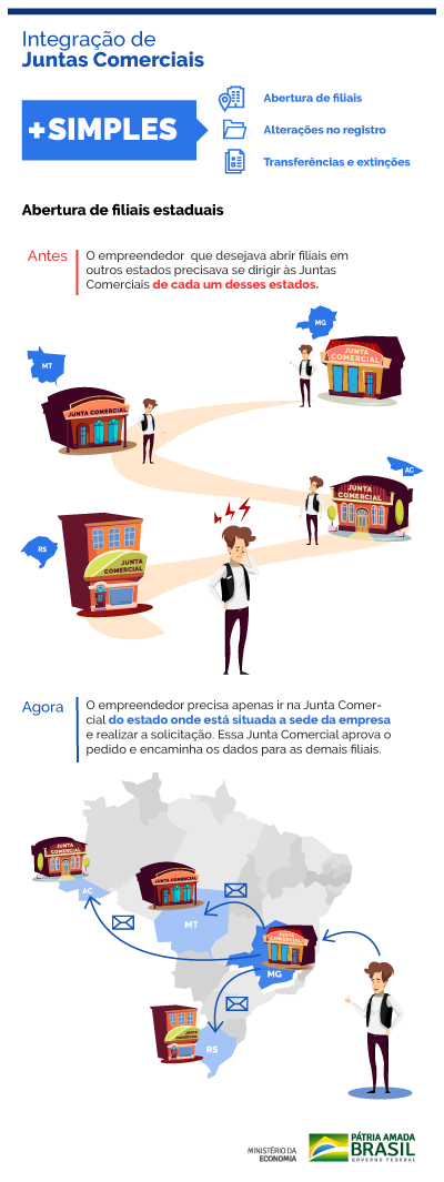 Agora, com a integração digital das juntas comerciais, basta realizar o pedido no estado onde se localiza a sede da empresa. Assim, a pessoa não precisa mais se deslocar fisicamente em mais de uma unidade federativa (estado e/ou Distrito Federal) para obter a aprovação de seu pedido de registro, por exemplo. Esse era um fator tido como entrave para novos empreendimentos empresariais.