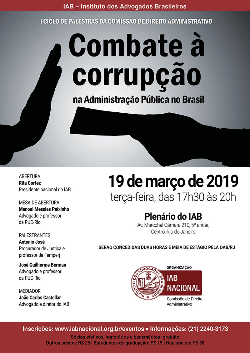 Combate à Corrupção na Administração Pública no Brasil é o tema do I Ciclo de Palestras da Comissão de Direito Administrativo da IAB. O evento será realizado no dia 19 de março de 2019, terça-feira, das 17:30h às 20h, no plenário da IAB, Av. Marechal Câmara, 210, 5º andar, Centro/RJ.
