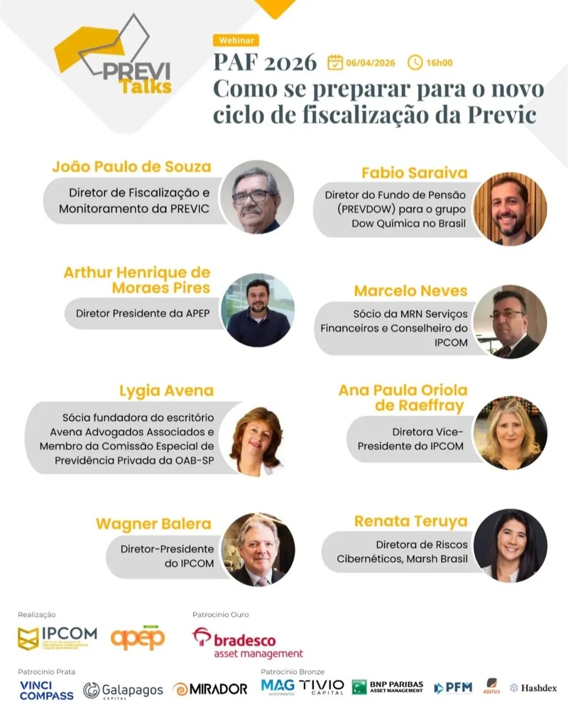 O Instituto Brasileiro de Previdência Complementar e Saúde Suplementar (IPCOM) e a Associação dos Fundos de Pensão e Patrocinadores do Setor Privado (APEP) promovem, no dia 6 de abril (segunda-feira), às 16h, uma edição especial do webinar PreviTalks. O encontro virtual dedica-se exclusivamente ao Plano Anual de Fiscalização e Monitoramento da Previc (PAF 2026), peça central para a conformidade das Entidades Fechadas de Previdência Complementar (EFPC).