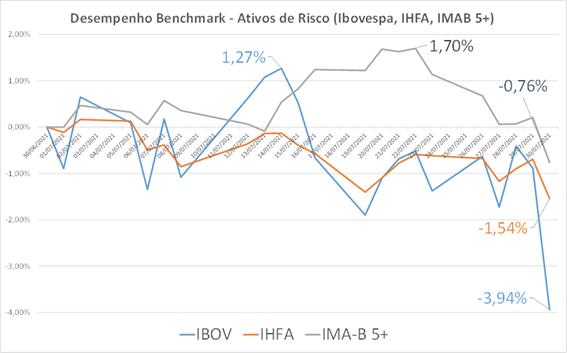 Julho foi um mês especialmente desafiador. A piora sequencial dos ativos ligados ao tema reflação global trouxe perdas, especialmente na estratégia de commodities. O Ibovespa caiu 3,9% no mês, acumulando alta de 2,3% no ano. Apesar disso, todos os nossos perfis de investimento encerraram o mês de julho, no acumulado do ano, com resultados brutos acima do CDI, do IFIX, IMA-B e IHFA (Índice de Hedge Funds Anbima). Nosso perfil arrojado, além desses benchmarks citados, supera, também, o IBOVESPA.