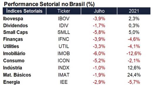 O desempenho dos setores econômicos no Ibovespa também tem se mantido bastante difuso, conforme demosntrado no quadro abaixo: