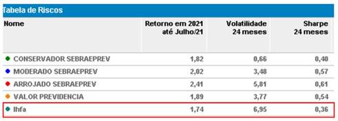 As posições em nossa carteira, citadas acima, têm nos garantido resultados superiores ao obtido pelos melhores fundos multimercados oferecidos no mercado. A tabela, abaixo, mostra o desempenho de nossos perfis de risco comparado ao IHFA - Índice de Hedge Funds ANBIMA (referência para o desempenho dos fundos multimercado). Esse índice é considerado a melhor referência de mercado para comparar com o desempenho do produto oferecido pelo Sebrae Previdência.