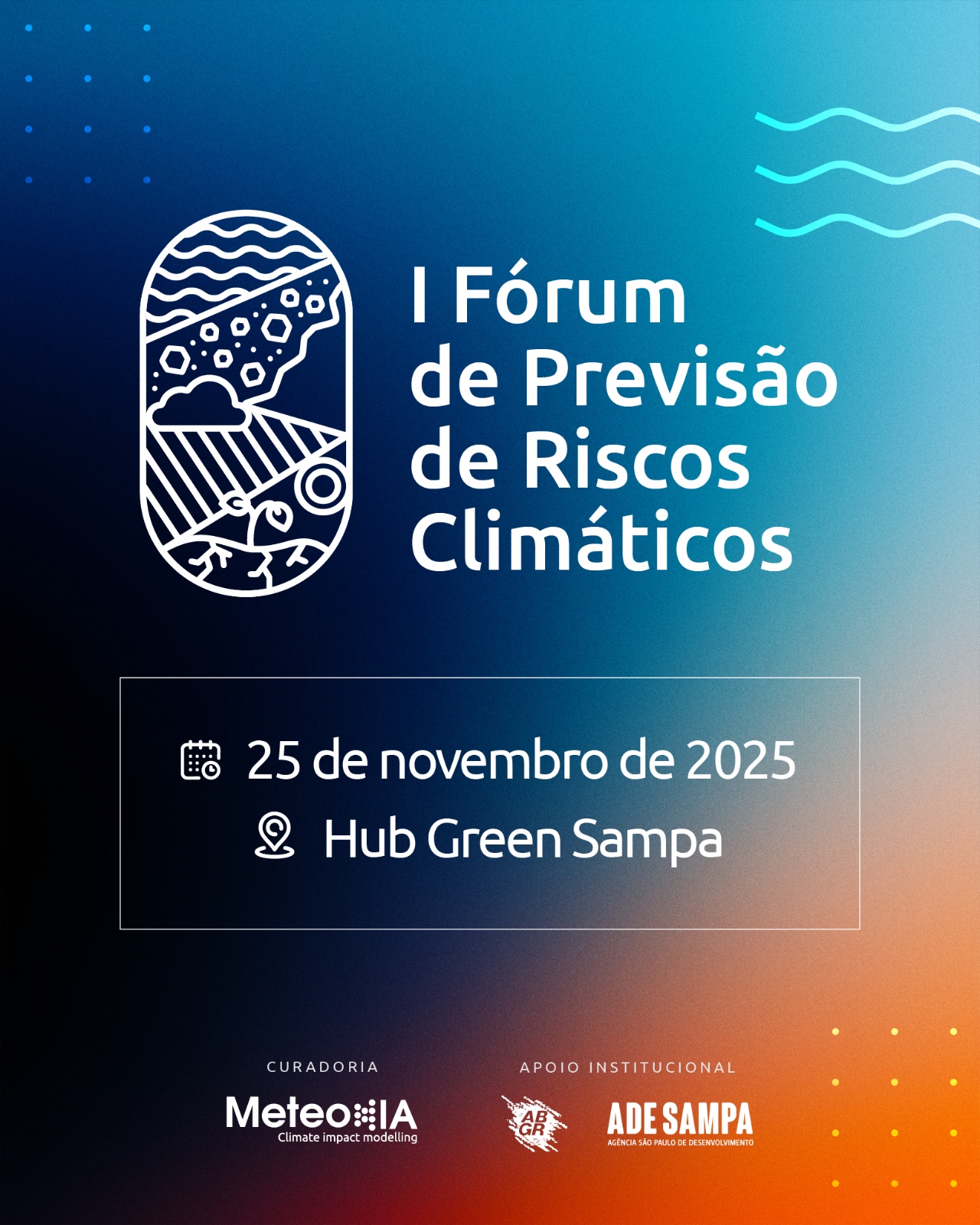 A MeteoIA, empresa brasileira especializada em inteligência artificial aplicada à previsão e gestão de riscos climáticos, realiza no dia 25 de novembro de 2025, das 13h30 às 18h, o I Fórum de Previsão de Riscos Climáticos, no Hub Green Sampa – Centro de Inovação Verde Bruno Covas, em São Paulo (SP).