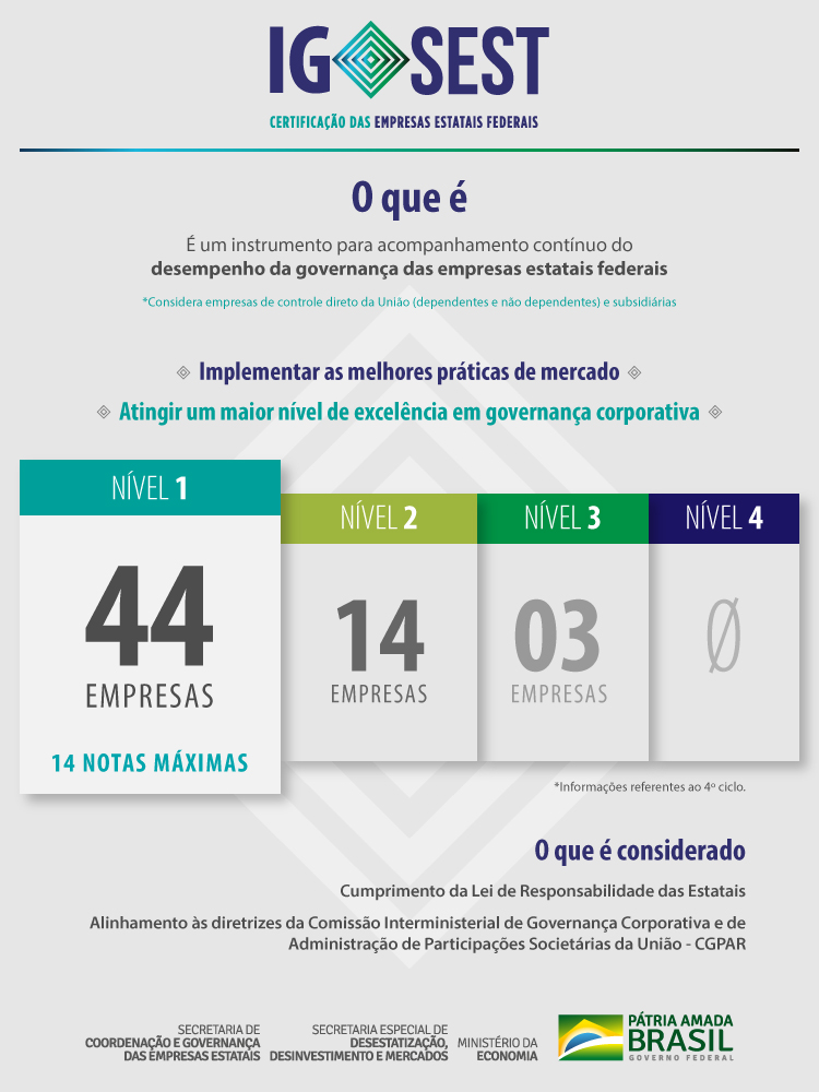 A Secretaria de Coordenação e Governança das Empresas Estatais (Sest), vinculada à Secretaria Especial de Desestatização, Desinvestimento e Mercados do Ministério da Economia, divulgou nesta sexta-feira (9/8) os resultados da 4ª Certificação do Indicador de Governança IG-SEST, instrumento de acompanhamento contínuo da governança das empresas federais de controle direto da União. Neste 4º ciclo, foram avaliadas 61 empresas. Dessas, 14 receberam a nota máxima:
