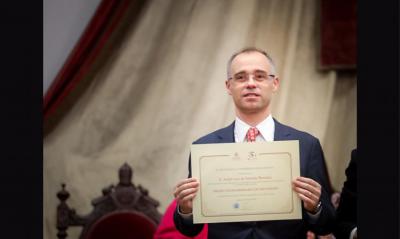 O advogado-geral da União, André Mendonça, recebeu nesta terça-feira (26/03) uma homenagem da Universidade de Salamanca, na Espanha, pela tese de doutorado que produziu sob o título: “Sistema de Princípios para a Recuperação de Ativos Procedentes da Corrupção”. Concedido para apenas 2% dos estudantes de pós-graduação da instituição, o prêmio extraordinário é uma forma de reconhecimento pelo grau de excelência alcançado na pesquisa, feita após trabalho em mestrado com o mesmo tema e em consonância com a atuação profissional de Mendonça na Advocacia-Geral da União.