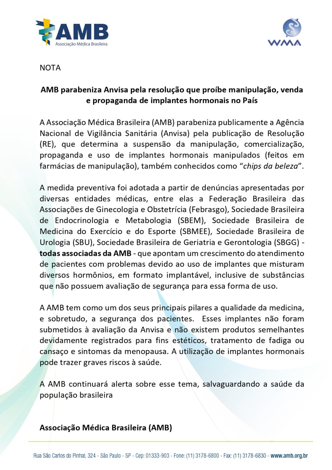 AMB parabeniza Anvisa pela resolução que proíbe manipulação, venda e propaganda de implantes hormonais no País