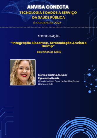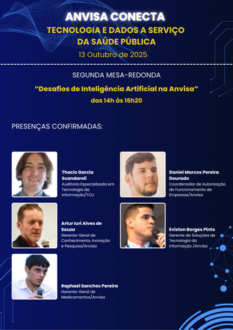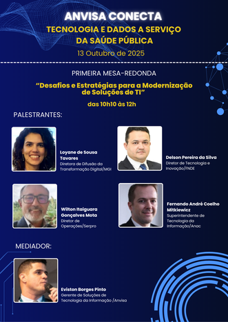 Na próxima segunda-feira (13/10), a Anvisa irá realizar o evento “Anvisa Conecta: Tecnologia e dados a serviço da saúde pública", um espaço dedicado ao diálogo estratégico sobre os desafios e caminhos para a modernização das soluções de TI no setor regulatório. O encontro será das 9h às 18h, no auditório da Agência, com a participação de convidados internos e externos.