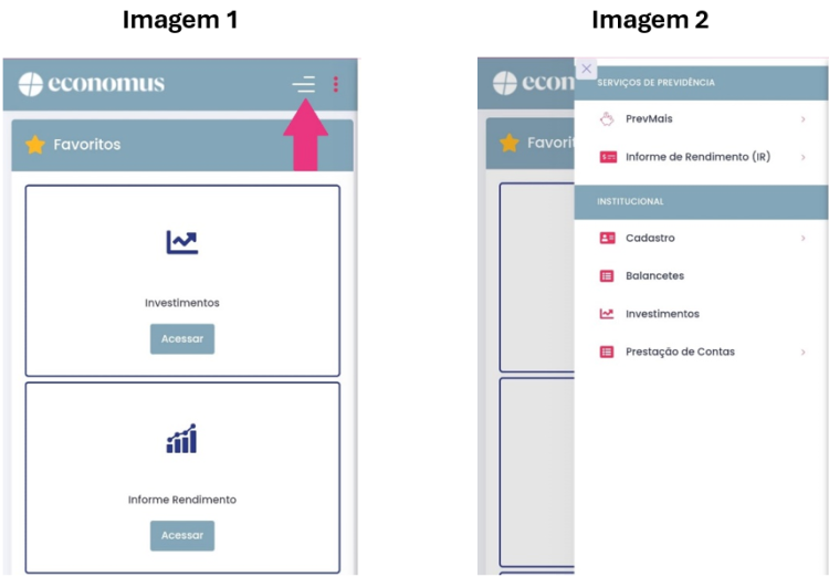 No canto superior direito, você pode clicar nos três pontos vermelhos para migrar entre as áreas de previdência e empréstimos, ou no ícone indicado pela seta (Imagem 1) para acessar o menu inicial (Imagem 2), que contém as seguintes opções: