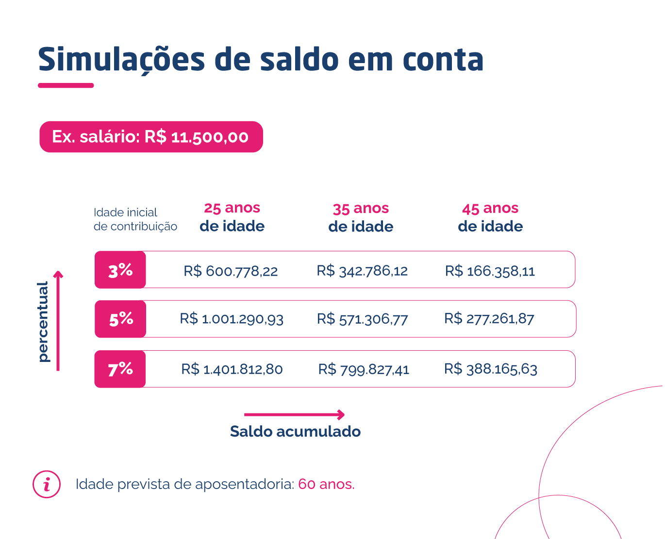 Lembre-se de que quanto maior for sua contribuição mensal, maior será o montante disponível no futuro para sua aposentadoria. Na simulação abaixo, é possível ver a evolução do saldo de conta, em 3 opções de percentuais: