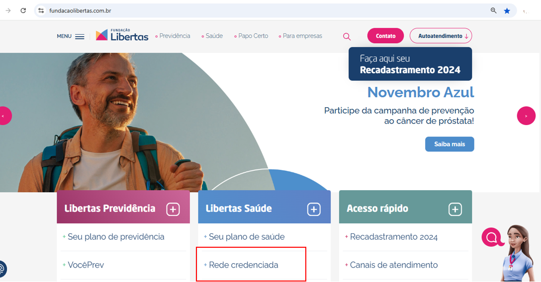 - Clique no botão “Rede Credenciada”. Disponível na página inicial, na coluna “Libertas Saúde”;