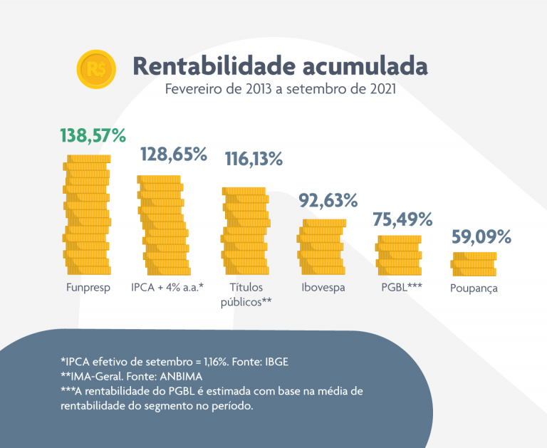 A rentabilidade consolidada é importante porque mostra a solidez da Funpresp e pode ser comparada a outros investimentos semelhantes, como planos de previdência abertos, poupança e títulos públicos, por exemplo.