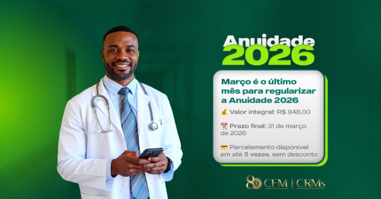 O CFM reforça a importância do planejamento financeiro e da regularização dentro do prazo, evitando imprevistos e pendências junto ao Conselho Regional de Medicina (CRM). Manter a anuidade em dia é condição essencial para a regularidade da inscrição profissional e para o pleno exercício da medicina.