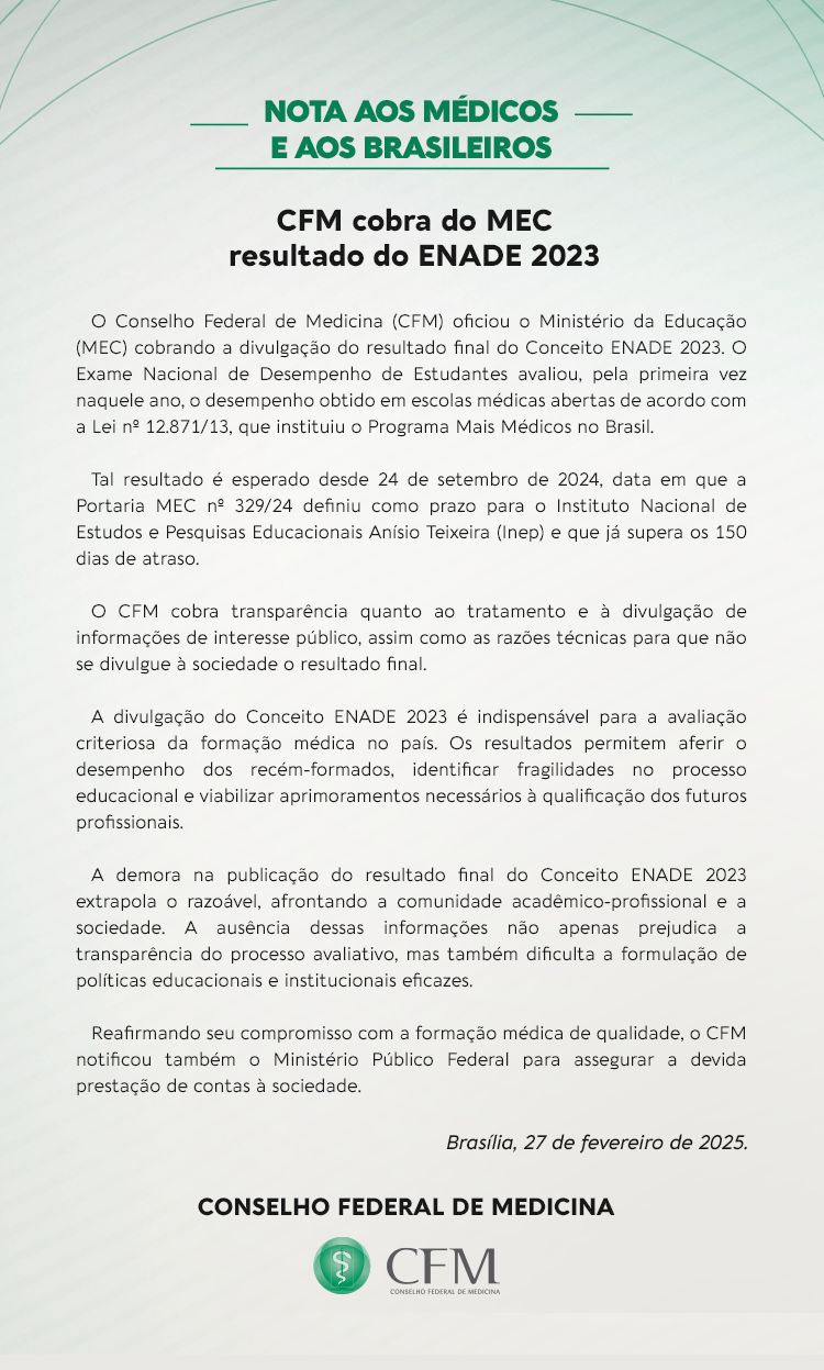CFM cobra do MEC resultado do ENADE 2023