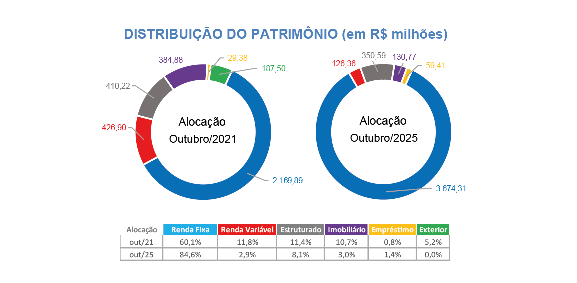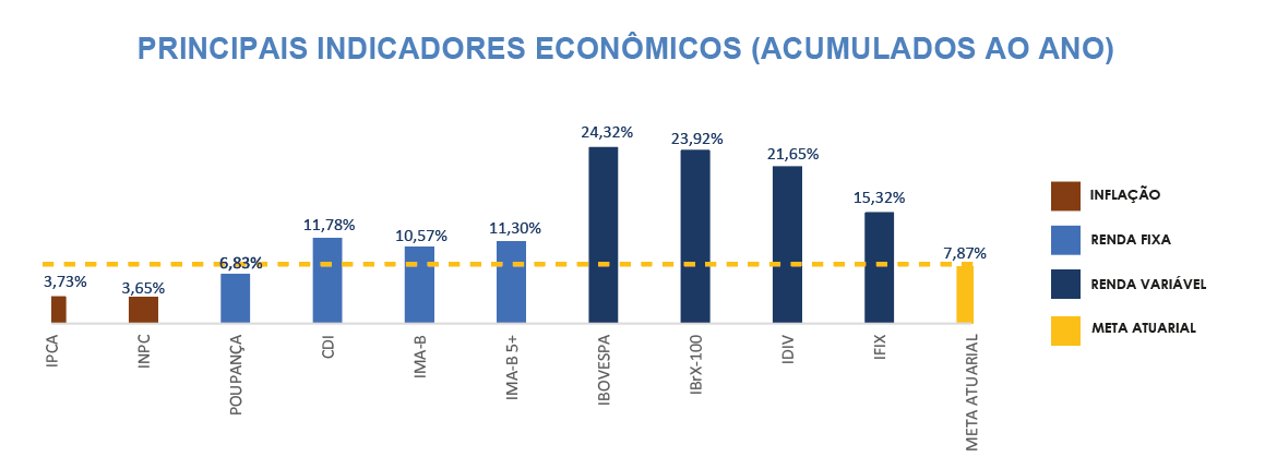 Em outubro, o Ibovespa fechou com variação de +2,26%, o CDI com +1,28%, a Poupança, +0,67%, o IMA-B, +1,05%, enquanto a Meta Atuarial foi de +0,43%.