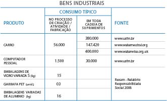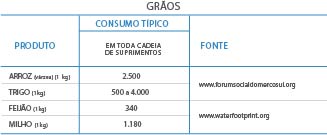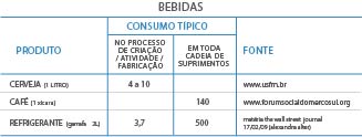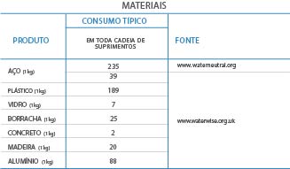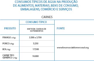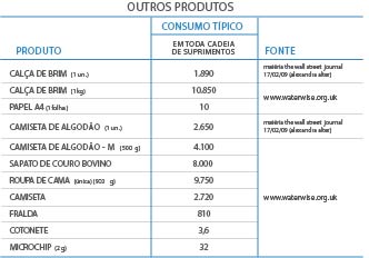 Nas tabelas a seguir apresenta-se uma compilação de estimativas obtidas em várias fontes. Isto permite se avaliar a “pegada da água”, um conceito recentemente criado e que é semelhante à “pegada ambiental”, a qual contabiliza o quanto um indíviduo ou processo contribui para o efeito estufa com a geração de CO2 – e (gás carbônico equivalente). Na Internet há sítios como o www.waterfootprint.org (Univ. Twente – Países Baixos) que permitem o cálculo, preenchendo-se os hábitos de consumo.