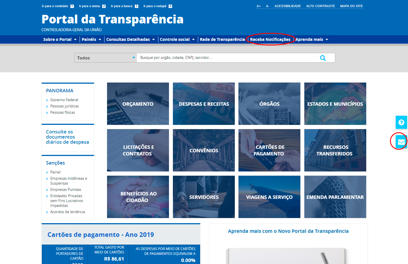 Outra novidade é a notificação sobre a atualização das bases de dados governamentais reunidas no Portal da Transparência, apresentadas por meio das consultas: Despesas; Licitações e Contratos; Benefícios; Cartões de Pagamento; Imóveis Funcionais; Receitas; Convênios; Servidores; Viagens a Serviço; e Sanções. A depender da base de dados escolhida, os usuários podem ser notificados sobre a atualização das informações com periodicidade diária, semanal e mensal. Saiba mais.