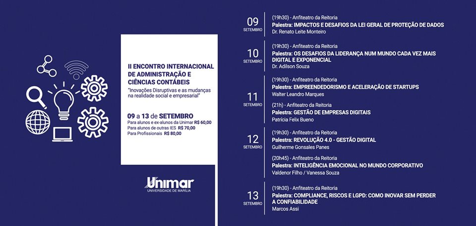 Com o tema ‘Inovações Disruptivas e as mudanças na realidade social e empresarial’, acontecerá entre os dias 09 e 13 de Setembro o II Encontro Internacional de Administração e Ciências Contábeis da Universidade de Marília (Unimar).