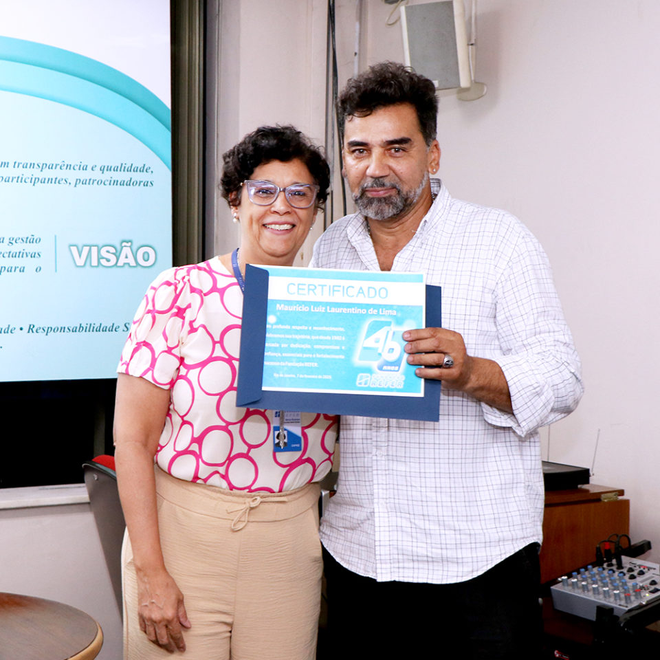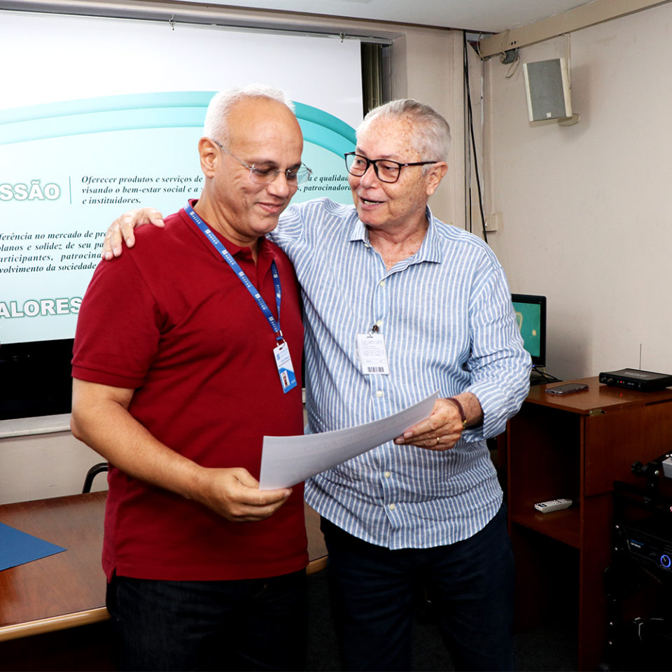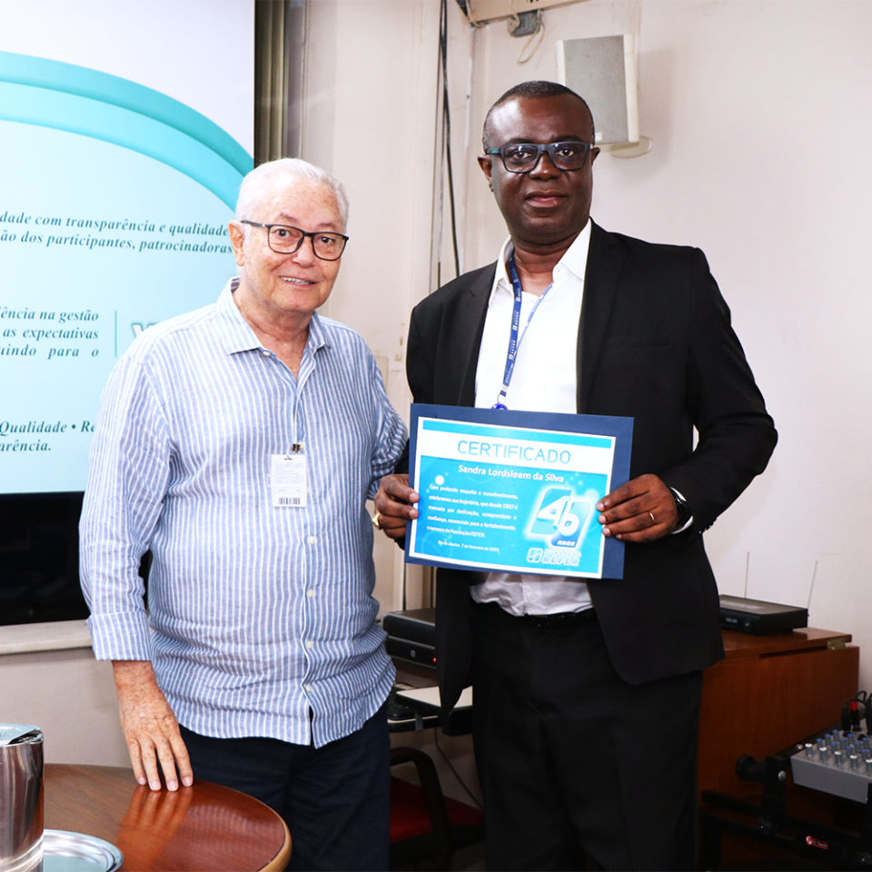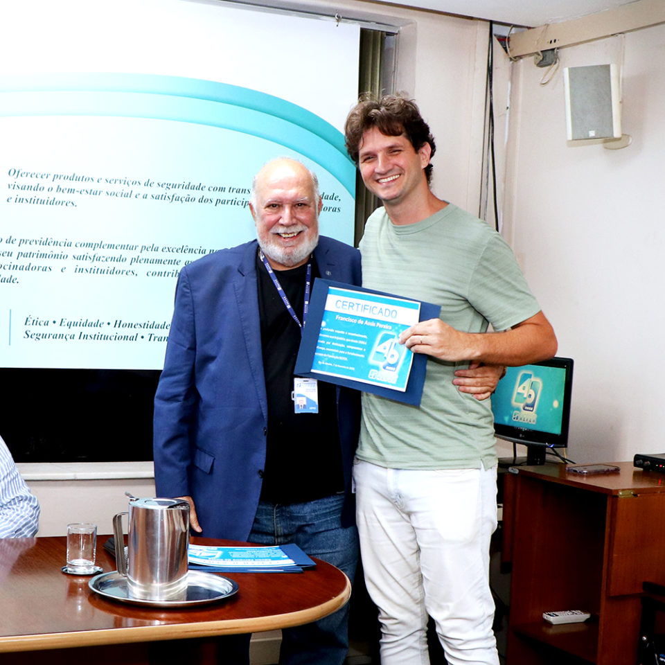 Antonio Malaquias é agraciado com o certificado pelo Diretor de Seguridade, Almir Ferreira Gaspar
