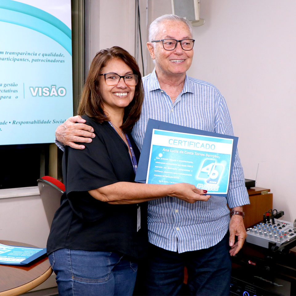 O Diretor de Seguridade, Almir Ferreira Gaspar, confere o certificado à Ana Lucia Barroso