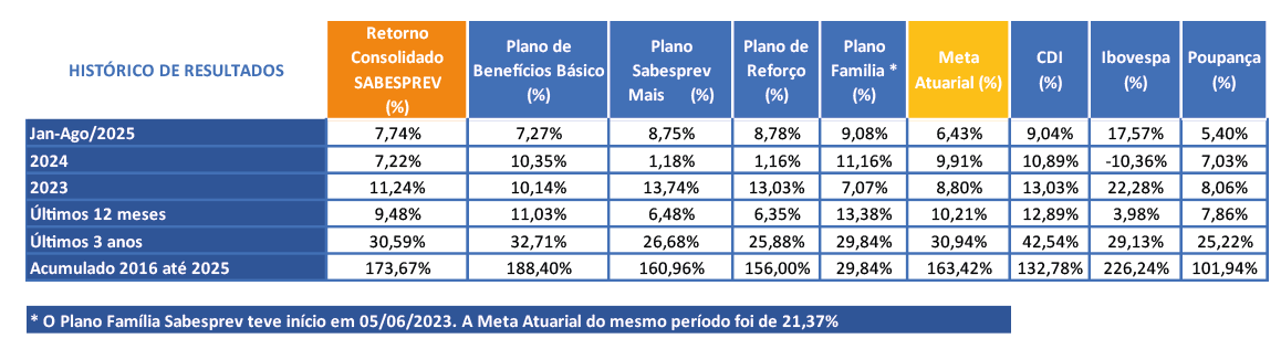 Em agosto, o Plano Família apresentou performance de +1,17%, o Plano de Reforço, +1,15%, o Plano SABESPREV MAIS, +1,11%, e o Plano BD, +0,48%.
