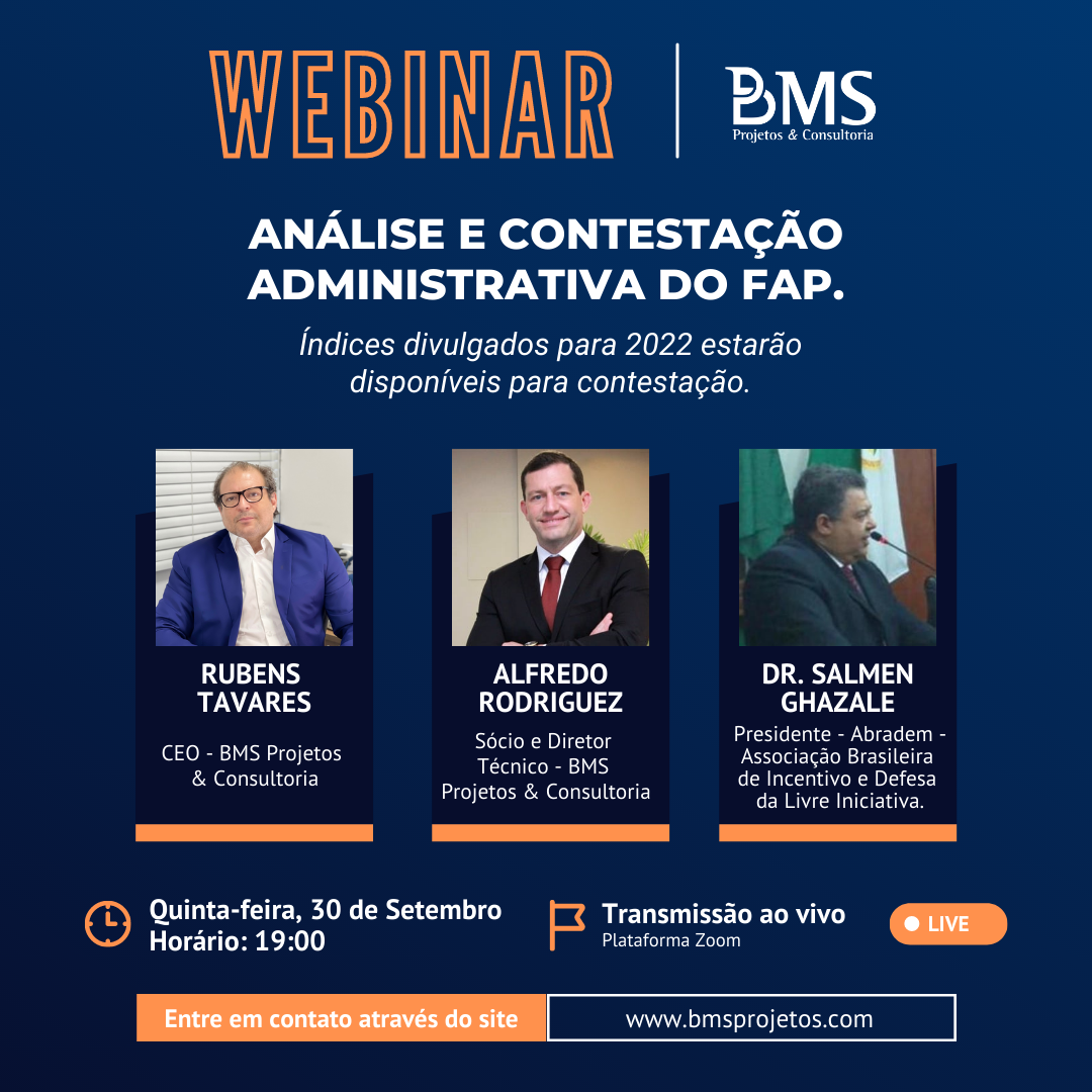 A contestação do Fator Acidentário de Prevenção (FAP) é uma oportunidade de grande valia para as empresas, como forma de reduzir a carga previdenciária sobre a folha de pagamento. Para debater a importância deste recurso, a BMS Projetos & Consultoria realiza o Webinar “Análise e Contestação Administrativa do FAP”, no próximo dia 30, às 19h.