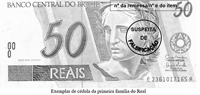 Art. 4º As instituições financeiras deverão registrar o número da remessa e o número de ordem de cada item, em cada cédula, carimbando-a com a expressão "SUSPEITA DE FALSIFICAÇÃO", conforme modelo de carimbo e áreas delimitadas da cédula definidos no Anexo 2 desta Instrução Normativa.