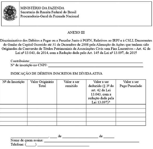 III - serão deduzidos os valores do IRPJ e da CSLL que tenham sido recolhidos até 31 de dezembro de 2013 em função da alienação posterior das ações decorrentes da conversão de títulos patrimoniais de associações civis sem fins lucrativos pelo próprio sujeito passivo, por empresa controladora ou por empresa controlada de forma direta, desde que tenha sido utilizado o custo original dos respectivos títulos patrimoniais na apuração do ganho e seja limitado ao valor do IRPJ e da CSLL incidentes sobre o ganho de capital apurado, considerando como valor de venda o valor verificado das ações na data de início das negociações em operação regular em bolsa de valores; e