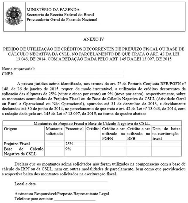 §3º No momento do requerimento de adesão ao pagamento à vista ou ao parcelamento, a pessoa jurídica deverá declarar, por meio de solicitação expressa e irretratável, os montantes de prejuízo fiscal e da base de cálculo negativa da CSLL a serem utilizados na amortização dos débitos de que trata esta Portaria Conjunta, devendo indicar, para cada órgão, o respectivo crédito a ser utilizado, na forma prevista no Anexo IV.