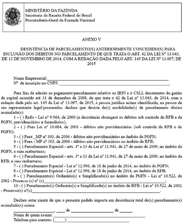 V - solicitação de desistência de parcelamentos ativos na forma prevista no Anexo V;