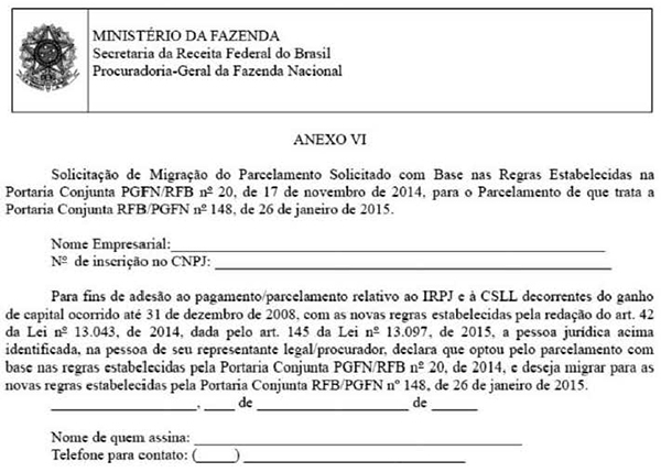 §1º A migração se dará por meio da apresentação do formulário contido no Anexo VI e tornará sem efeito o pedido de parcelamento efetuado com base nas regras estabelecidas na Portaria Conjunta PGFN/RFB nº 20, de 2014.